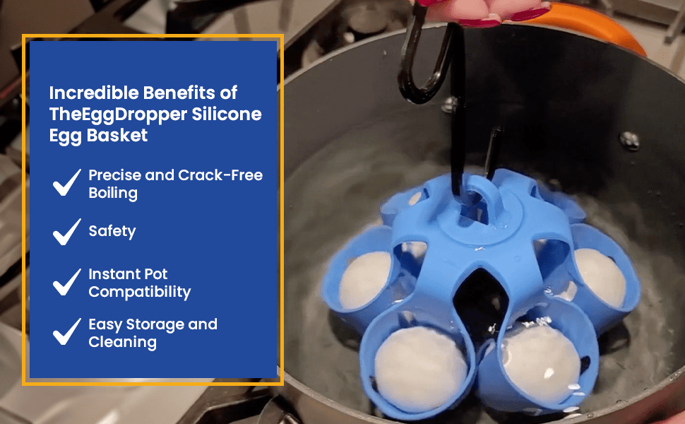 EggDropper offers an innovative solution for boiling eggs more consistently and safely by using premium kitchen-grade silicone to protect each egg, ensuring even cooking and easy handling without the need for scooping with a spoon or ladle. It's designed to simplify the cooking process, making it more efficient and less prone to accidents, and is both dishwasher safe and compact for easy storage.
